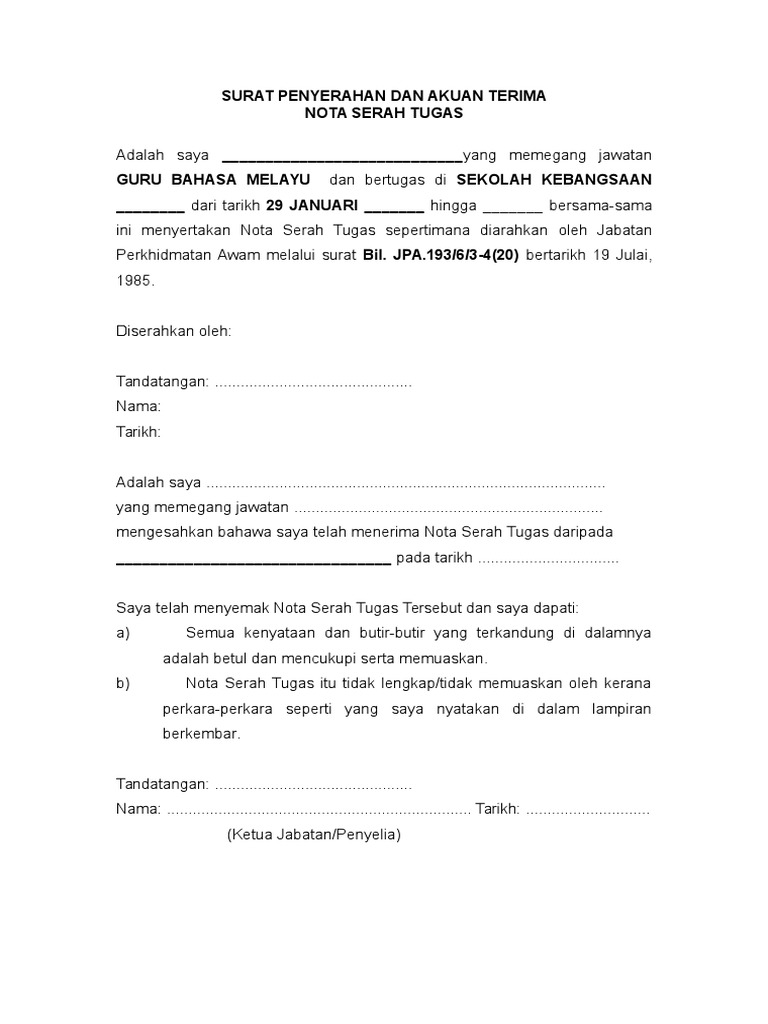 Nota serah tugas smk che tom. Surat penyerahan dan akuan nota. Serahan contoh surat rasmi penyerahan dokumen. Serahan contoh surat rasmi penyerahan dokumen from imgv2 1 f.scribdassets. Surat tugas karyawan adalah surat tugas yang diberikan oleh atasan kepada karyawan.